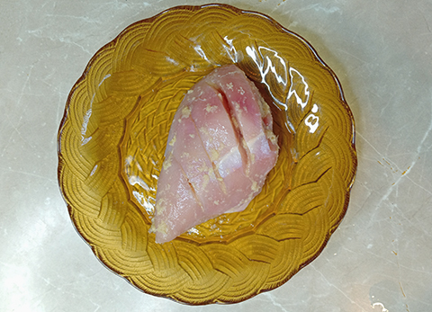 Make cuts on top of the chicken breast piece, so that the spices enter inside the meat easily and makes it tender.  Add salt, half garlic and ginger paste, and vinegar.  Mix everything well and leave it to marinate for two hours.