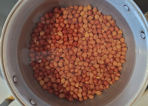 To prepare this dish, you need to prepare the chickpeas day before by soaking it in water with soda overnight (at least for eight hours).  Next morning wash it and boil it with soda for one and a half hour.  Add salt also.  As this takes time, so, you will be preparing for 3 to 4
