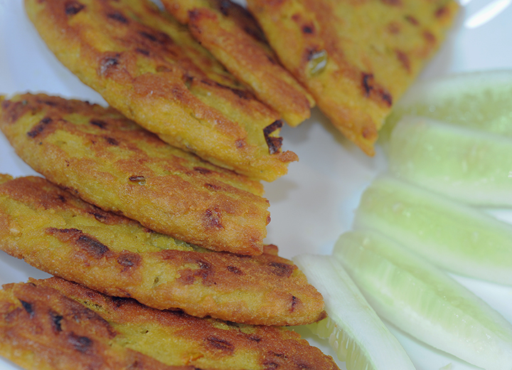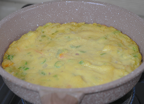 To prepare the Moonglet,  add onions, chilies, vegetables, and baking soda in the moong paste.  Mix everything.  Put a frying pan on the stove and add 1 tablespoon of oil or butter.  Pour one third of the batter on the pan, spread out and smooth it.  Cover the pan and cook for ten minutes on low flame.