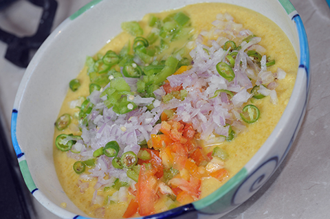 Grate or cut finely onions, green chilies, capsicum, coriander leaves.