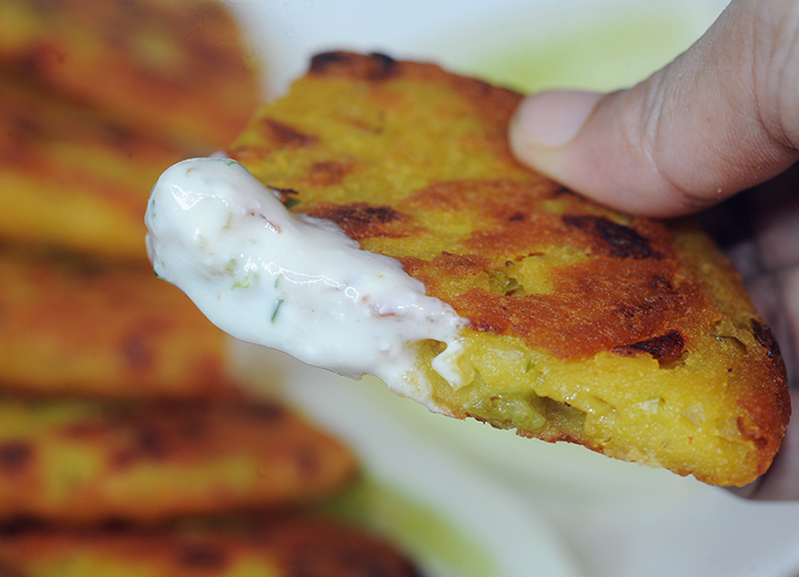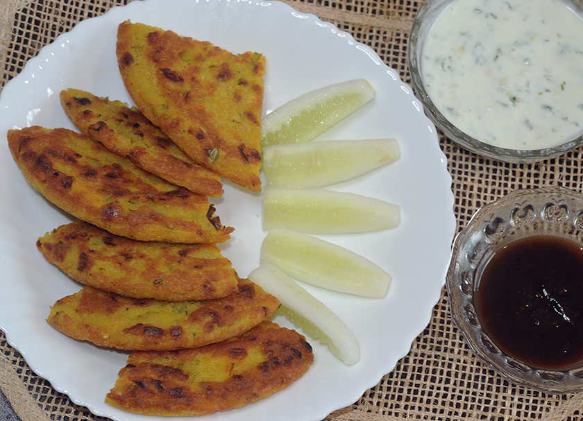 Take out the lid and pour some oil or butter on top and Flip.  Cook for another 7-8 minutes.  Remove the pan from the stove.  Place the Moonglet on a plate and cut Into four pieces.  Enjoy with a sauce or chutney!  Prepare two other Moonglets in the same way.